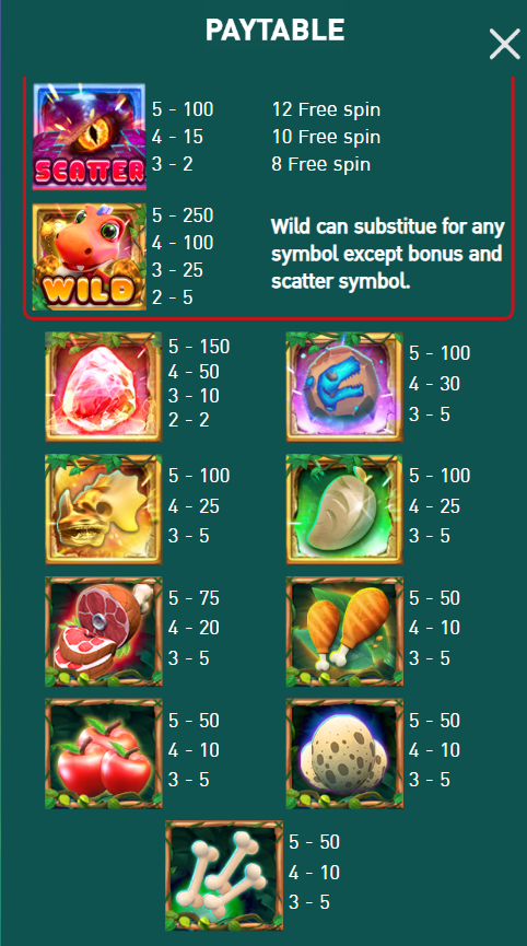 สัญลักษณ์ Scatter รูปดวงตาไดโนเสาร์ หากปรากฏบนรีล จำนวน 3-5 ตัว จะได้รับโบนัสหมุนฟรี (Free Spins) จำนวน 8 -12 ครั้ง
